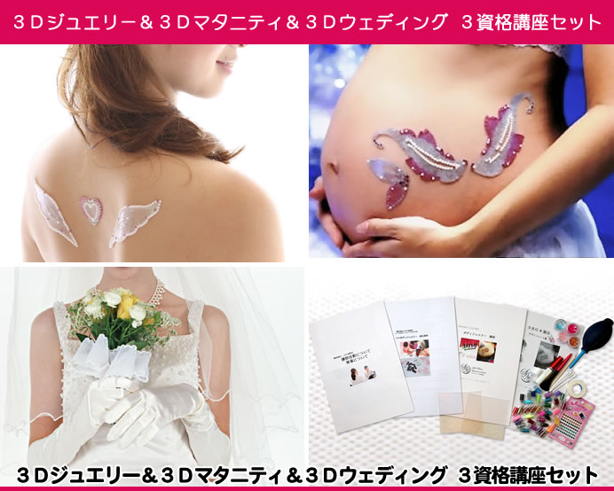3Dボディジュエリーとは/単価について/特殊シートについて/技法/粘着/転写(レシピ付き)/グラデーション法/装着法/仕上げ法/各種技法の長所・短所/それぞれのポイント・コツ/色の使い方/施術シーンについて/ウェディング3Dジュエリーについて/マタニティについて/週数別特徴(胎児写真付き)/注意事項/保管方法/衛生について/備品の購入(仕入れ)方法/開業について/講師について