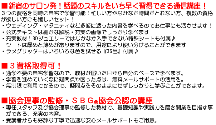 3Dジュエリー テキスト/3D特殊シート(厚)/3D特殊シート(薄)/ラメグリッター(36色)/パールストーン/粘着付ラインストーン/スワロフスキー(色ランダム)/筆/ウッドスティック/綿棒/ディプロマ申請書/SBG®認定筆記試験