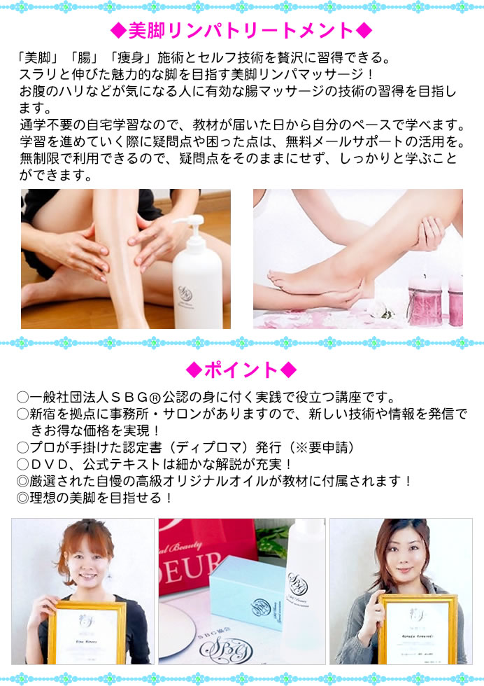 「美脚」「腸」「痩身」施術とセルフ技術を贅沢に習得できる。