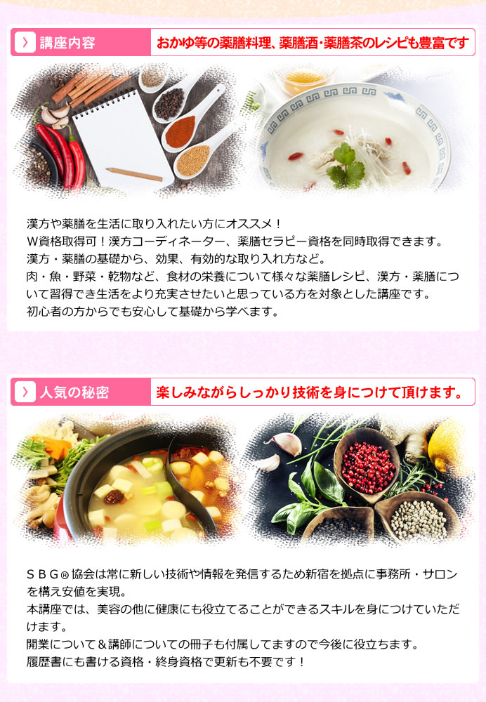 W資格取得可/漢方コーディネーター、薬膳セラピー資格を同時取得できます。